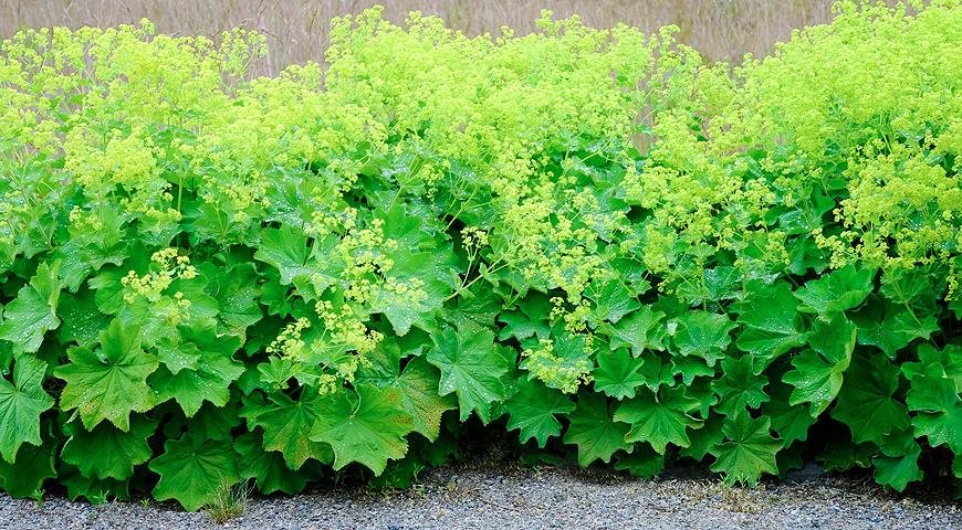 К одному из преимуществ манжетки можно отнести продолжительный период цветения. Цветоносы вырастают из междоузлий, они прямостоячие, на них формируются зонтичные цветки, с большим количеством желтовато-зеленых бутонов, истончающих приятный аромат, притягивающий насекомых. Подробнее