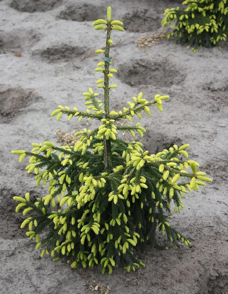 Хвойное вечнозеленое дерево конической формы. Крона плотная, но не очень регулярная. Взрослая ель может достигать высоты 8-12 м и ширины 5 м. Годовой прирост в высоту 15-20 см, в ширину 5 см. В 10 лет высота около 2,5 м и 1,5 м в диаметре. Является самым декоративным представителем елей восточных благодаря ярко-желтым молодым приростам, которые появляются позднее чем у других сортов ели, в июне месяце. Вырастая, приросты становятся зелеными.