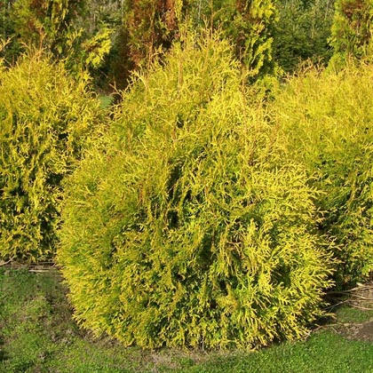 Туя западная ‘Рейнголд’ вечнозеленый кустарник в молодости округлый, позднее колонновидный с развитым верхушечным побегом.