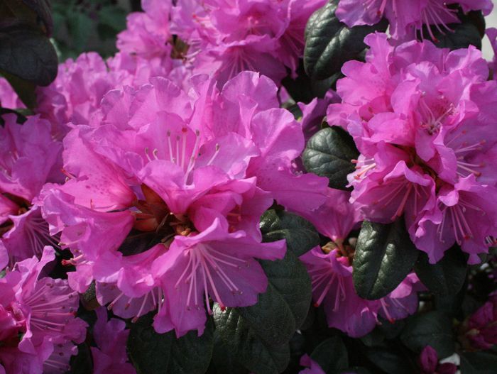 Цветки у рододендрона ПЖМ Элит малиново-розовые, конусообразной формы, собраны в кисти по 4-9 штук.